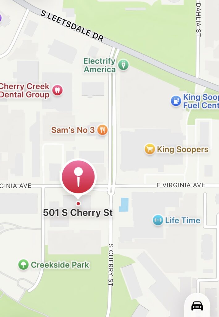 Our office is located across the street from Life Time Cherry Creek (Formerly the Cherry Creek Athletic Club). All parking is free and above ground.